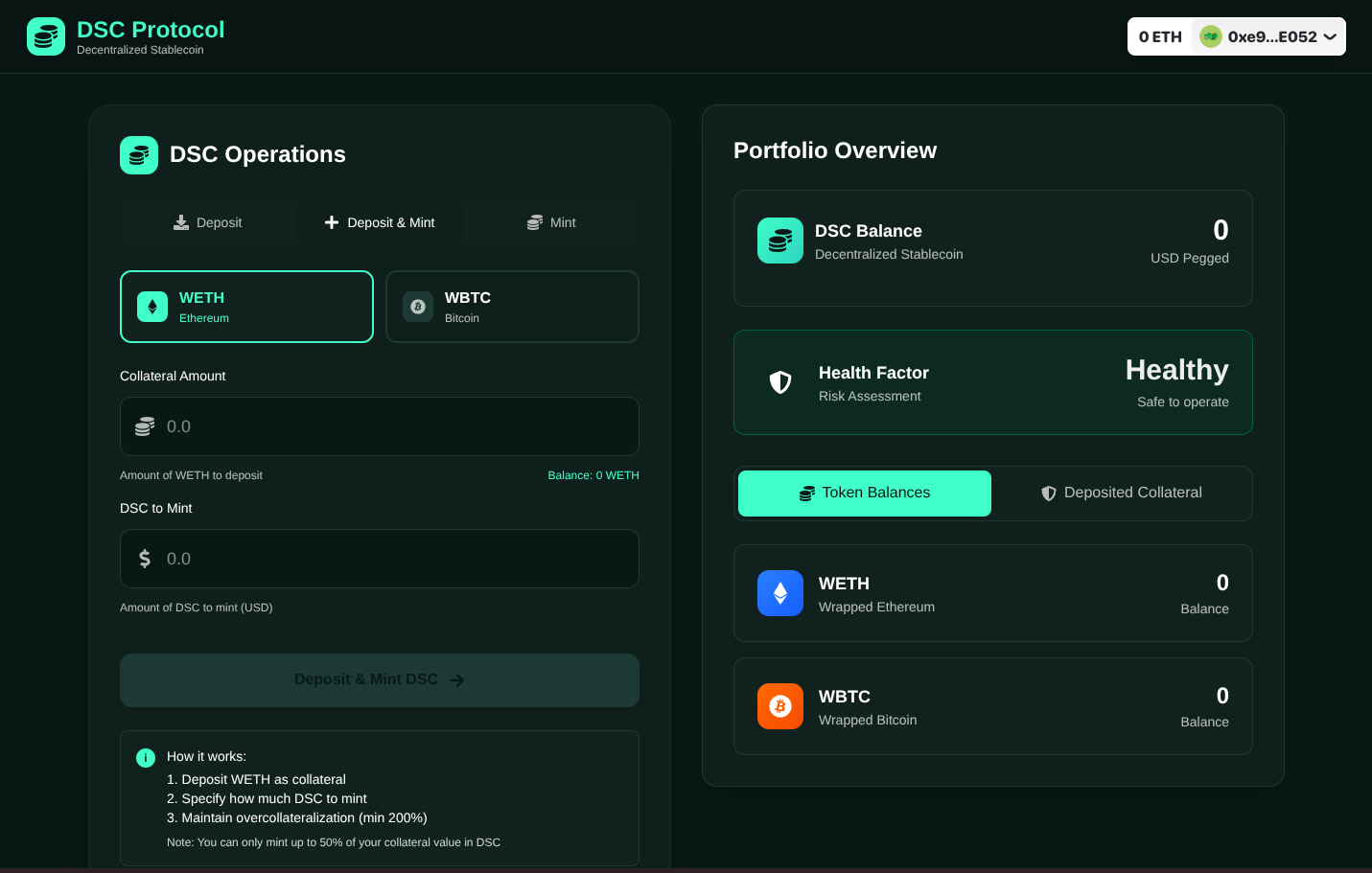 Decentralized Stablecoin Protocol, USD-peg backed by WETH/WBTC. Mint by depositing collateral, burn to repay, health-factor enforced, Chainlink-secured pricing, and straightforward liquidations.